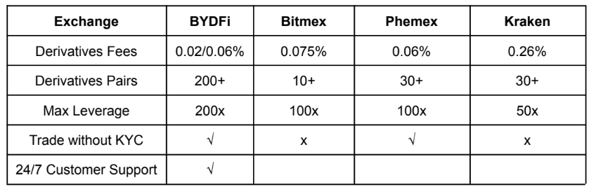 BYDFi has carved a niche in the competitive cryptocurrency exchange landscape by prioritising security, offering multiple trading options, and maintaining a low-fee structure. Its user-friendly platform, coupled with a demo account and copy trading, makes it accessible to beginners, while the advanced trading tools and high-leverage options cater to the needs of seasoned traders. BYDFi’s overall offerings make it a great option for traders seeking a reliable crypto exchange with diverse options.