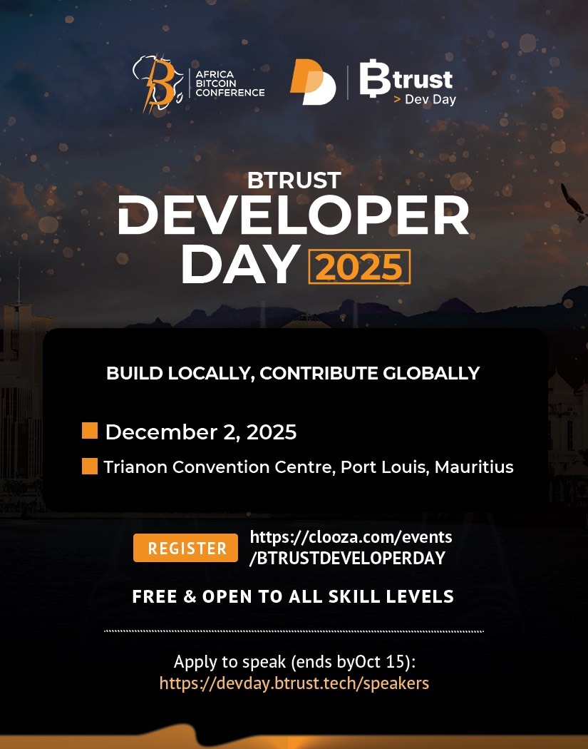 This year’s highly anticipated event will take place on December 2, 2025, at the Trianon Convention Centre in Port Louis, Mauritius, and will serve as the official developer-focused precursor to the 2025 Africa Bitcoin Conference. Through this partnership, Btrust and the Africa Bitcoin Conference are creating a unique platform that empowers Africa’s technical community, catalysing local innovation and global collaboration in the Bitcoin ecosystem.