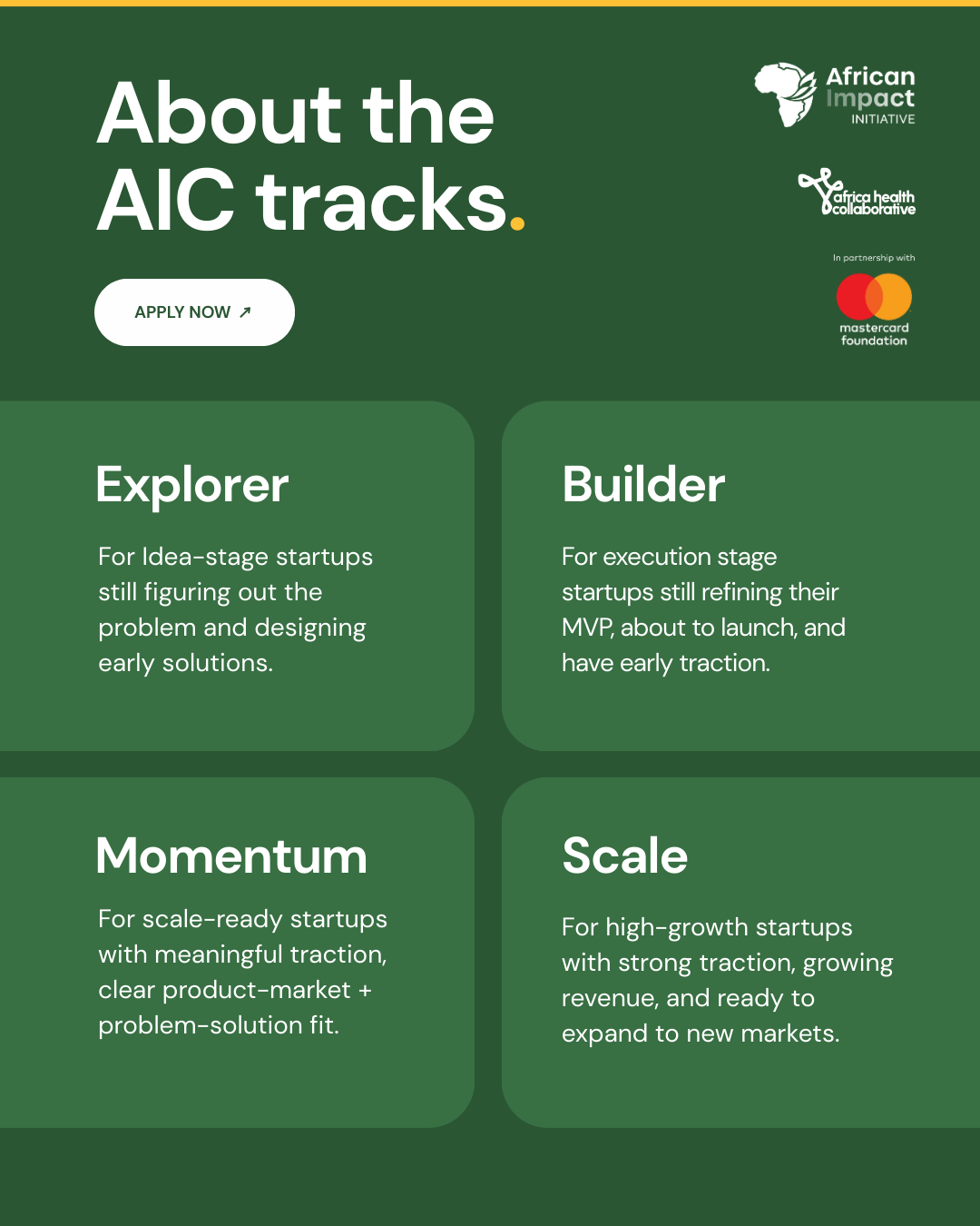 If you’re building something solving a real African challenge with global potential, you should apply. Whether you’re still validating a problem or preparing for Series A, there’s a track for you. What the AIC is looking for are founders committed to learning, willing to do the work, and focused on building sustainable, revenue-generating businesses that can become category leaders.