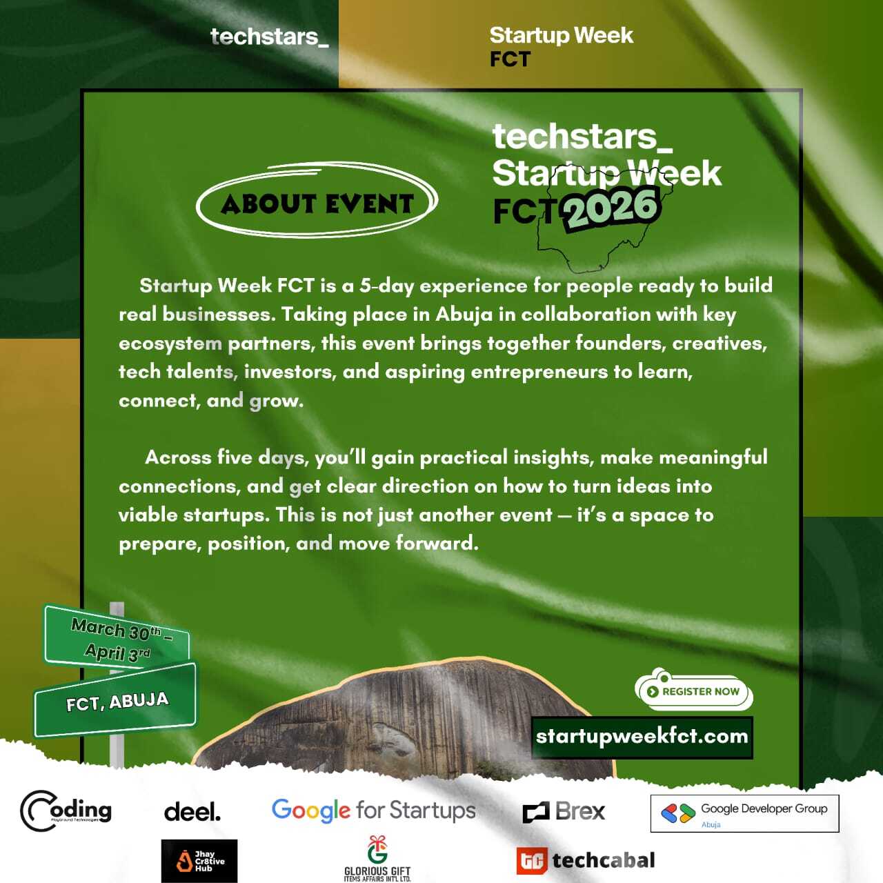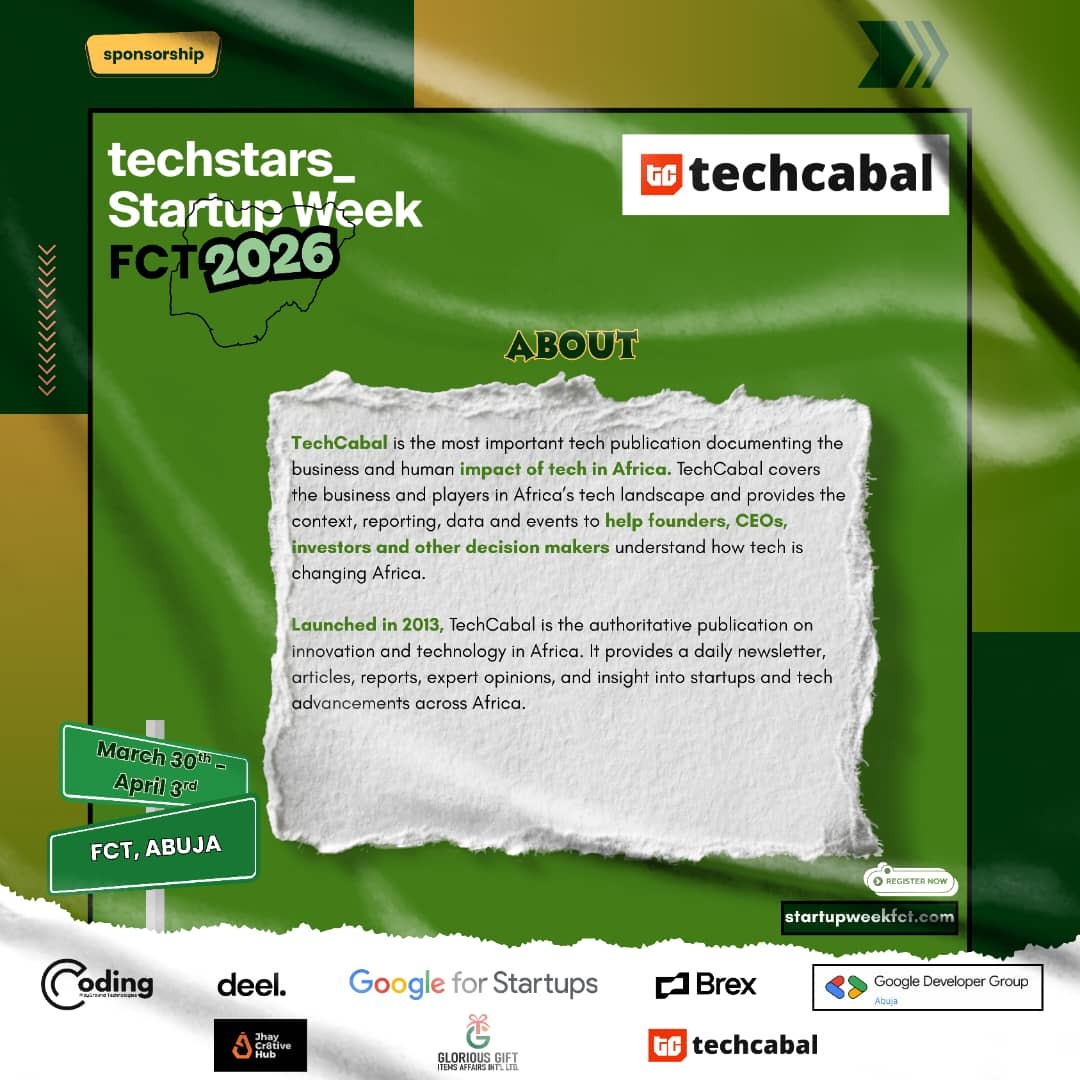 Techstars Startup Week FCT 2026 is proudly supported by a range of ecosystem partners: including Coding Playground, Deel, Brex, Google for Startups, Marlocks Technologies, Glorious Gift Items Affairs Int’l Ltd, TechCabal, GDG, and JHay Creative Hub Ltd – all committed to strengthening Nigeria’s startup landscape through collaboration, skills transfer, and founder-focused initiatives.