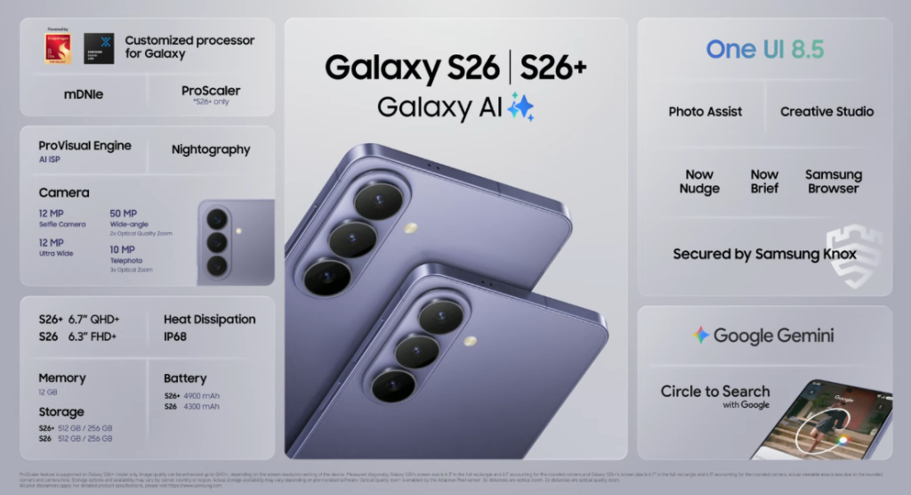 - Galaxy S26 series: The flagship lineup featuring the S26, S26+, and the S26 Ultra.